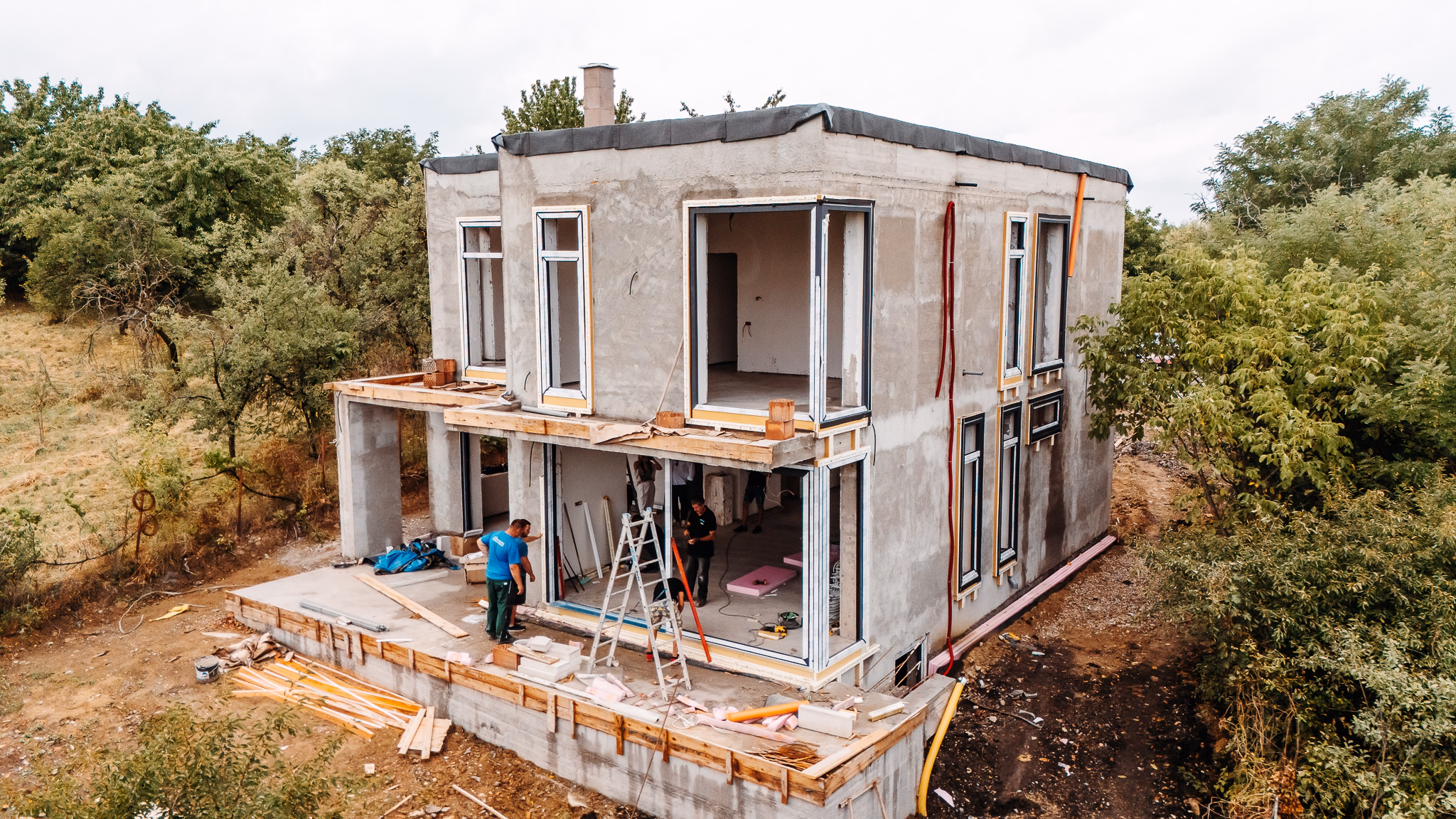 Tâmplărie PVC Veka Softline 82 Spectral clasa A cu sudură Graf, feronerie Maco Multimatic full ciupercă cu balamale ascunse și ușă culisantă cu ridicare Veka Motion – montaj realizat la standard de casă pasivă cu precadre, înălțătoare și solbancuri termice Nyxon, etanșare Penosil și folii illbruck.